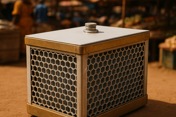 une glacière low-tech, 100 % autonome, fonctionnant uniquement grâce Ă  l’Ă©vaporation d’eau.